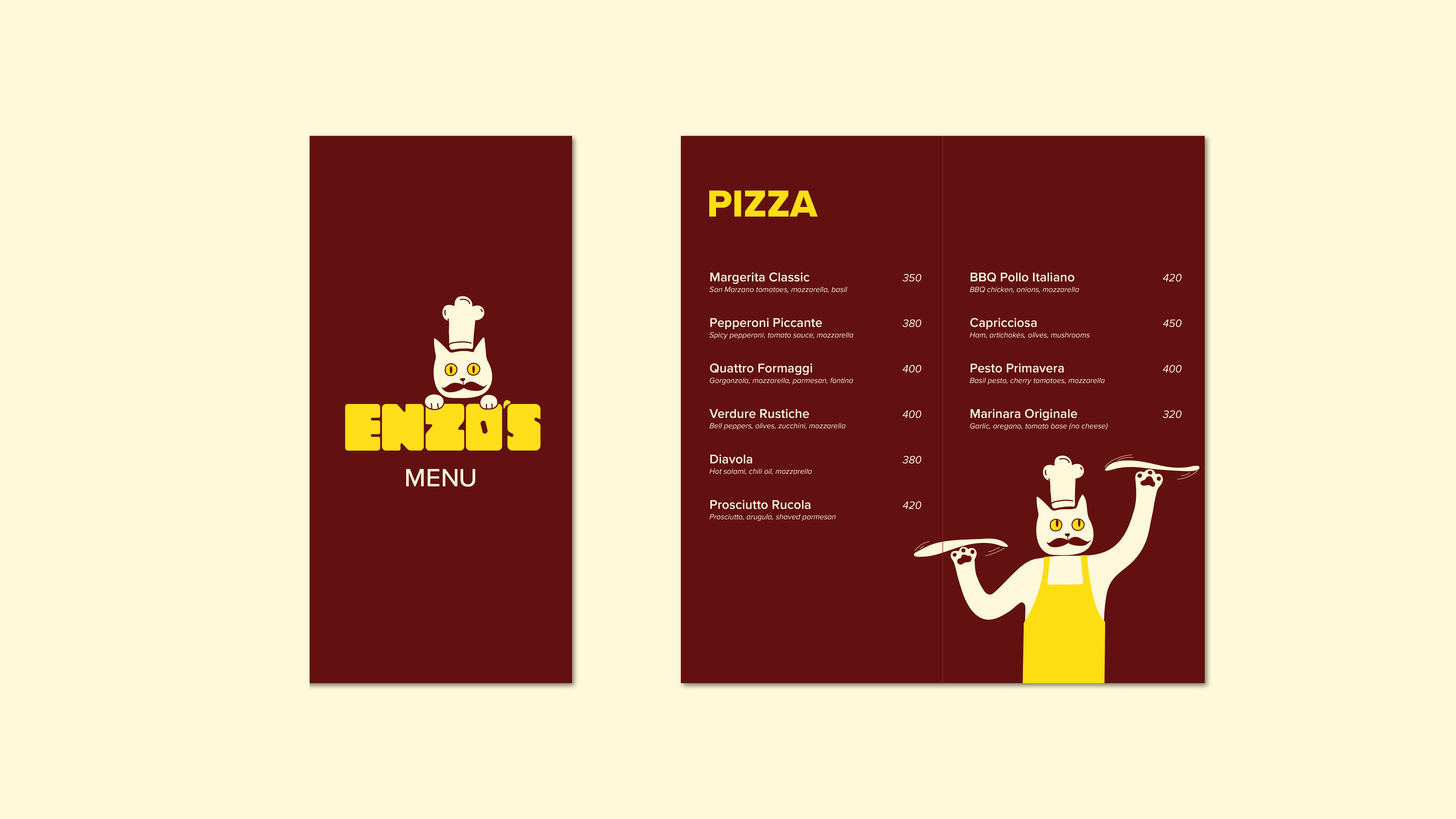 An authentic but fun branding for Enzo’s, an Italian restaurant opening soon in the city. From brand identity to collaterals, the entire brand had to be created while keeping in mind the Italian heritage of the restaurant and playful, friendly personality of the brand.